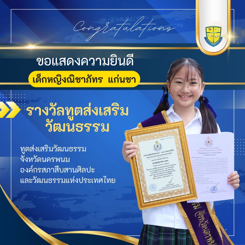เด็กหญิงณิชาภัทร แก่นชา รางวัลทูตส่งเสริมวัฒนธรรมBy admin / July 1, 2024 ขอแสดงความยินดีกับ เด็กหญิงณิชาภัทร แก่นชารางวัลทูตส่งเสริมวัฒนธรรมทูตส่งเสริมวัฒนธรรม จังหวัดนครพนมองค์กรสภาสืบสานศิลปะ และวัฒนธรรมแห่งประเทศไทย#sarasas #sarasasburapha #SWBPSTAR