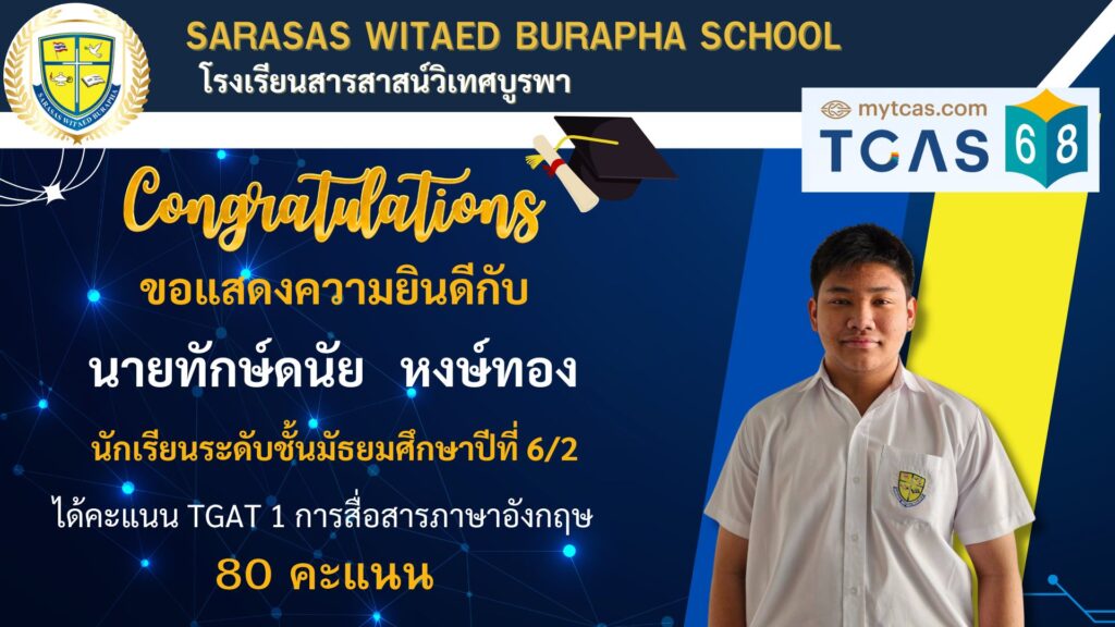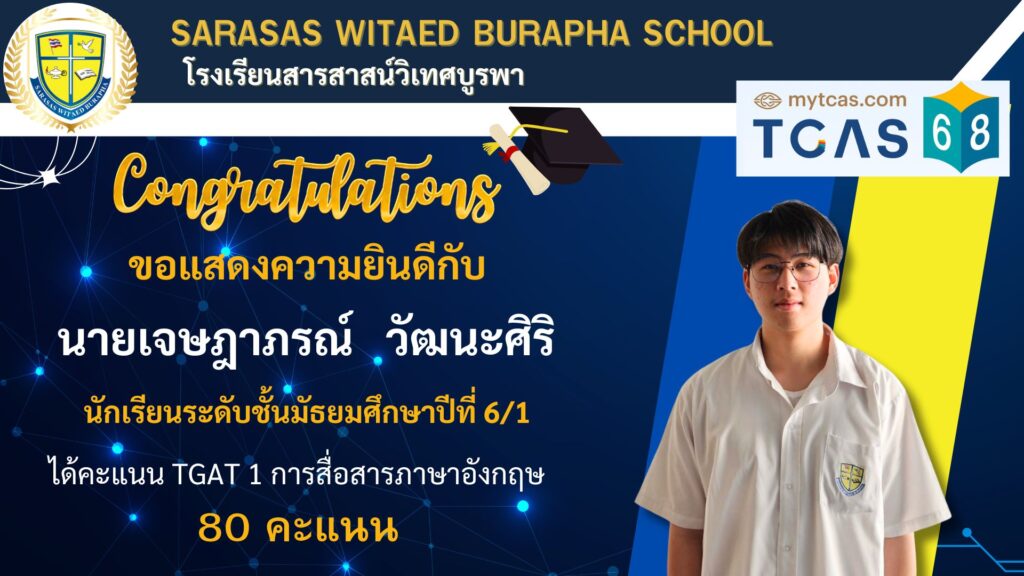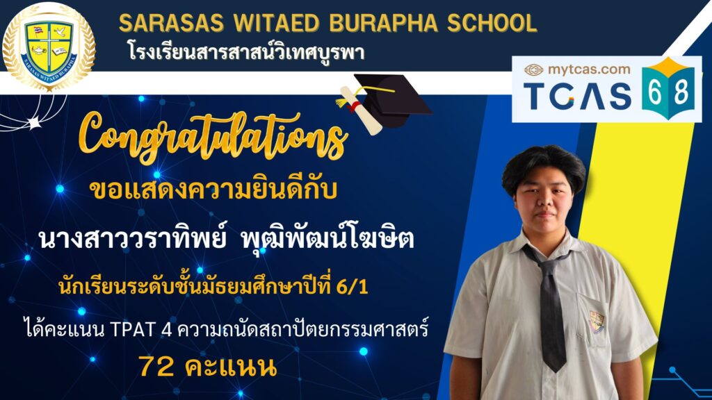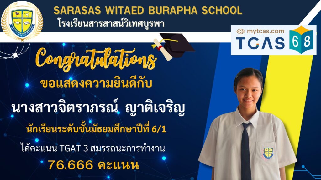 ขอแสดงความยินดีกับนักเรียนที่สอบ TCAS68By admin / January 22, 2025 ขอแสดงความยินดีกับ นายปัณณทัต สุรินทร์นักเรียนระดับชั้นมัธยมศึกษาปีที่ 6/1 ได้คะแนน TGAT 1 การสื่อสารภาษาอังกฤษ 81.666 คะแนน ขอแสดงความยินดีกับ นายเจษฎาภรณ์ วัฒนะศิรินักเรียนระดับชั้นมัธยมศึกษาปีที่ 6/1 ได้คะแนน TGAT 1 การสื่อสารภาษาอังกฤษ 80 คะแนน ขอแสดงความยินดีกับ นายทักษ์ดนัย หงษ์ทองนักเรียนระดับชั้นมัธยมศึกษาปีที่ 6/2 ได้คะแนน TGAT 1 การสื่อสารภาษาอังกฤษ 80 คะแนน ขอแสดงความยินดีกับ นางสาวจิตราภรณ์ ญาติเจริญนักเรียนระดับชั้นมัธยมศึกษาปีที่ 6/1 ได้คะแนน TGAT 3 สมรรถนะการทำงาน 76.666 คะแนน ขอแสดงความยินดีกับ นางสาววราทิพย์ พุฒิพัฒน์โฆษิตนักเรียนระดับชั้นมัธยมศึกษาปีที่ 6/1 ได้คะแนน TPAT 4 ความถนัดสถาปัตยกรรมศาสตร์ 72 คะแนน #sarasas #sarasasburapha #SWBPSTAR #โรงเรียนสารสาสน์วิเทศบูรพา#TGAT #TCAS68