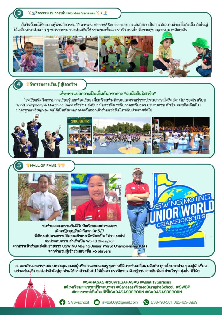 ขอร่วมแสดงความยินดีกับนักเรียนคนเก่งของเรา เด็กหญิงบุญรัตน์ กันทา Gr.5/7 ที่เลือกเส้นทางความฝันของตัวเองเพื่อที่จะเป็น โปรฯกอล์ฟ จนประสบความสำเร็จเป็น World Champion จากการเข้าร่วมแข่งขันรายการ USWING Mojing Junior World Championship (CA) จากจำนวนผู้เข้าร่วมแข่งขัน 76 players